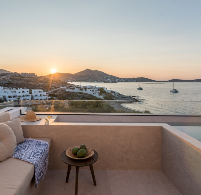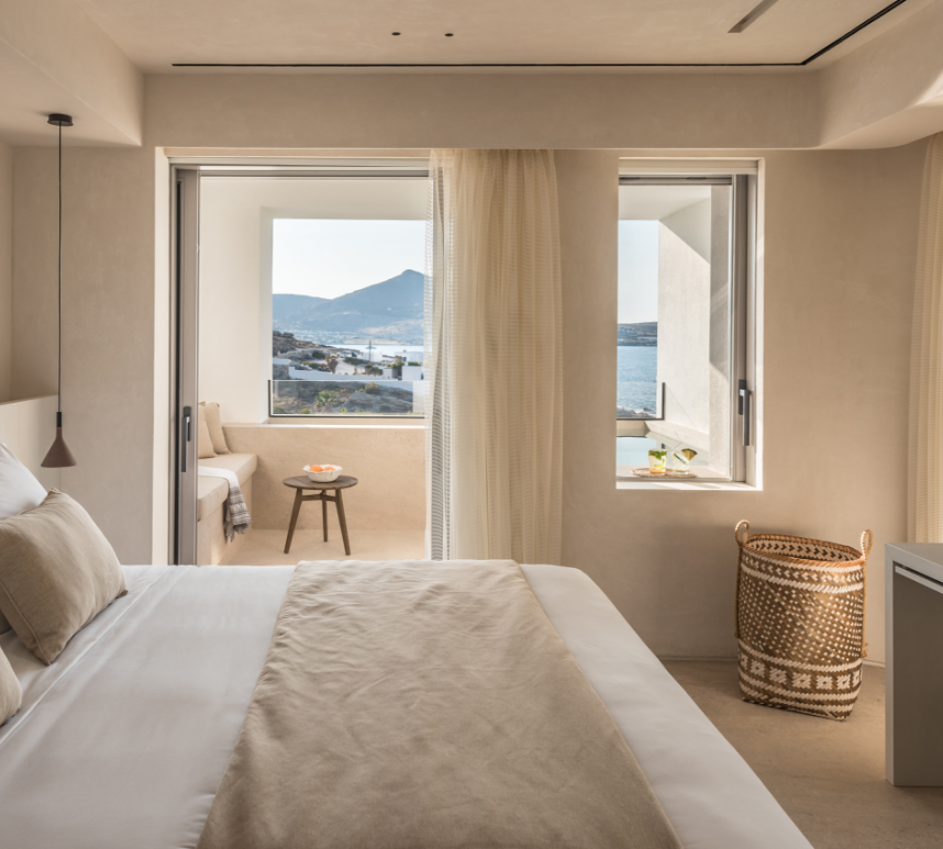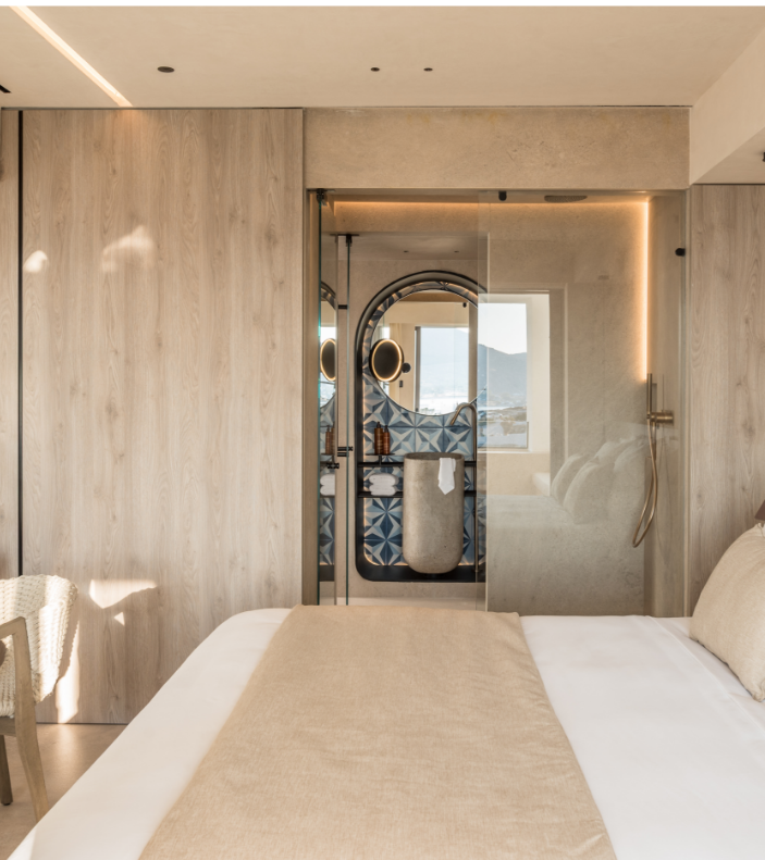 Wall-mounted shelving in solid-color HPL with chamfered drawers for unobstructed chair arm movement, paired with a bed base, headboard with concealed lighting, and integrated bedside shelving—all finished in matching solid-color HPL.