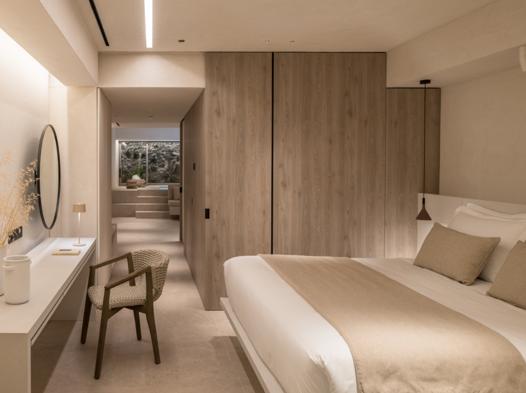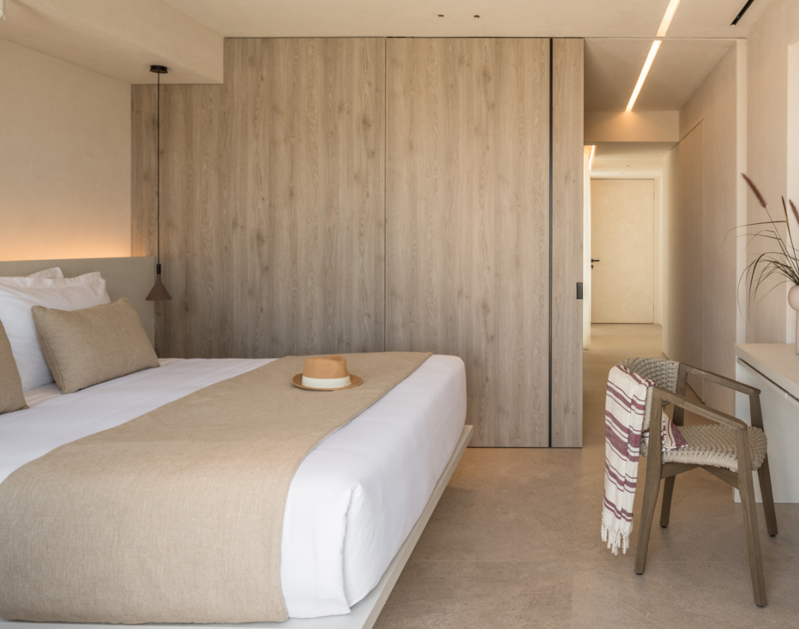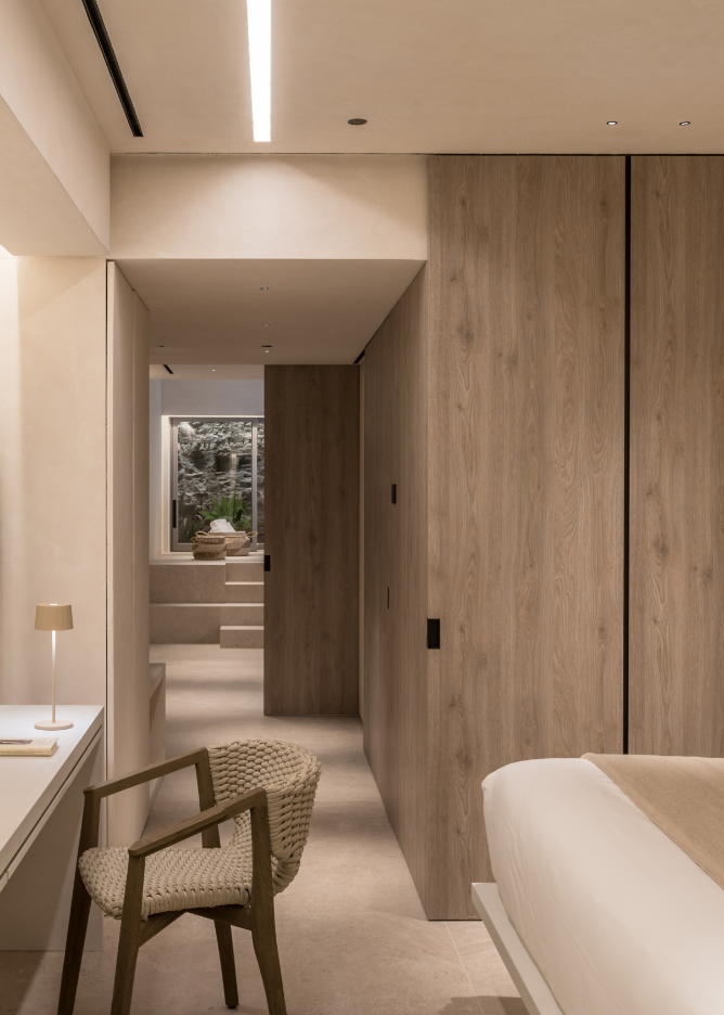 Wardrobe with MDF panels finished in microcement, located on the left side of the corridor.